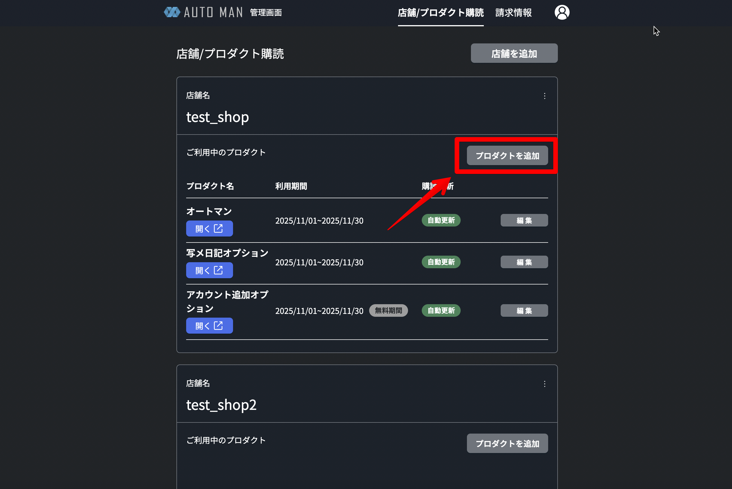 2.プロダクト追加ボタンをクリックします。