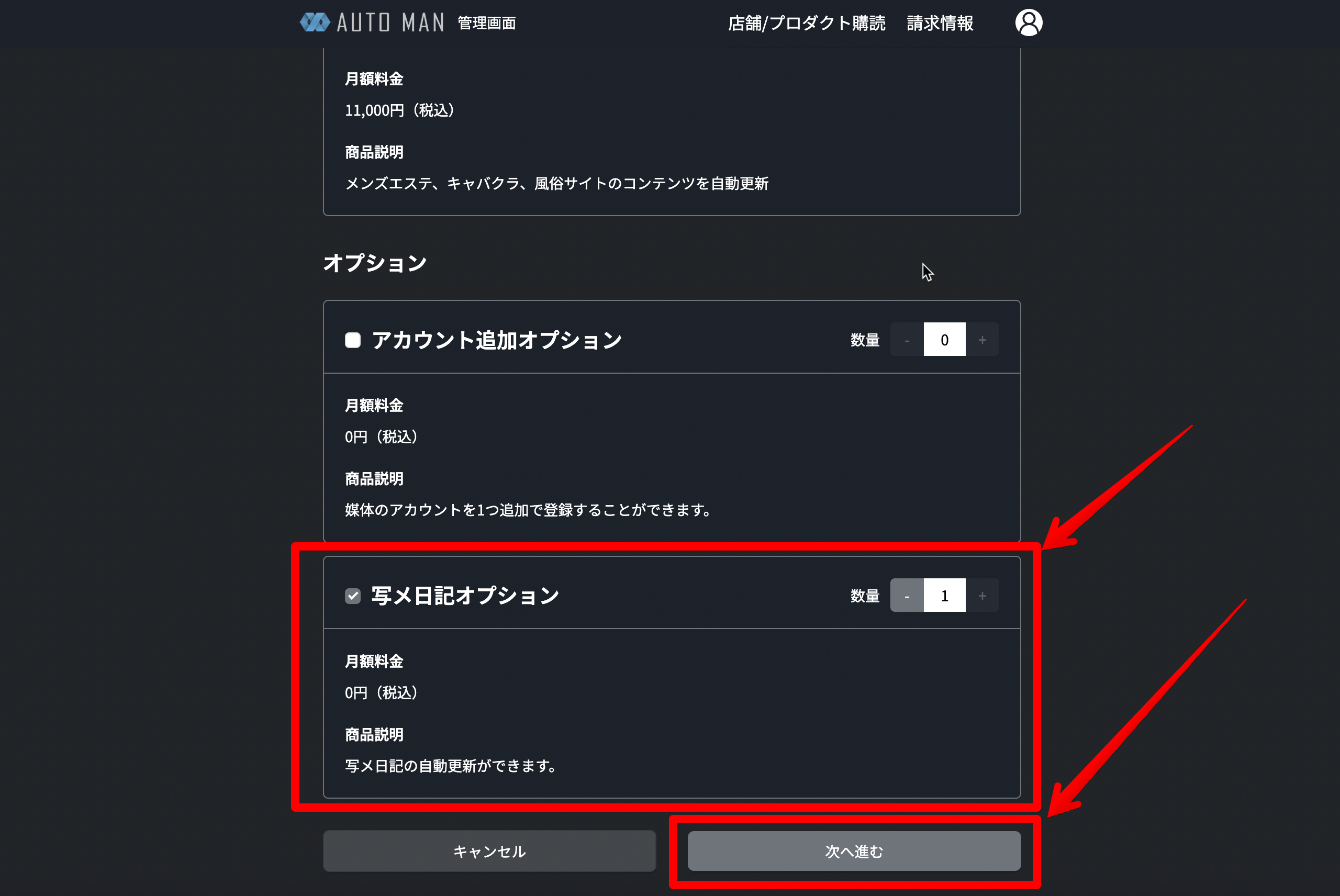 写メ日記自動更新を使うためにはプロダクトの購読注文(無料)が必要です。