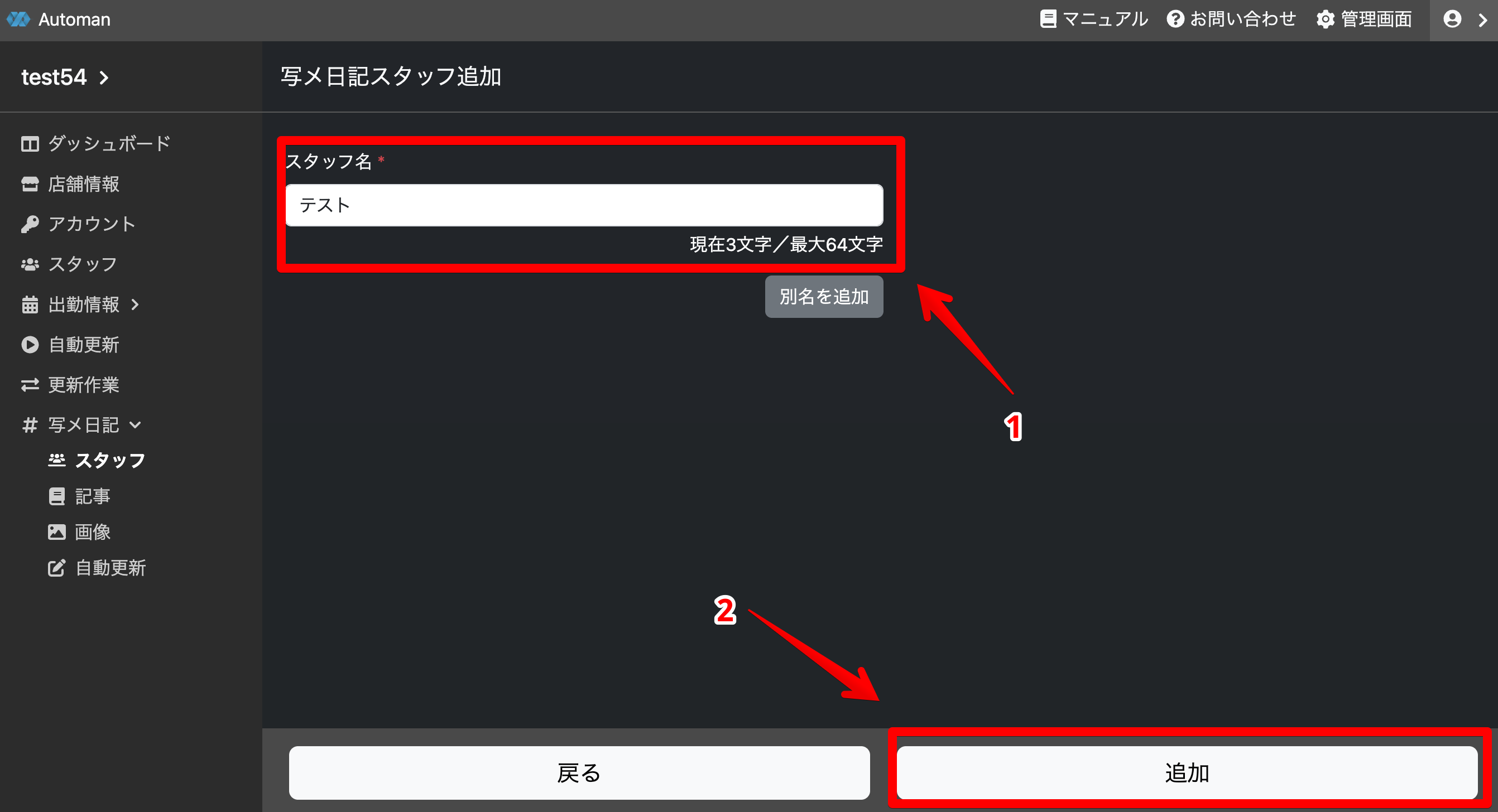 名前を入力しスタッフを追加します。名前は実際媒体上で使われているものを入力してください。媒体によって名前が異なる場合は別名 を設定してください。