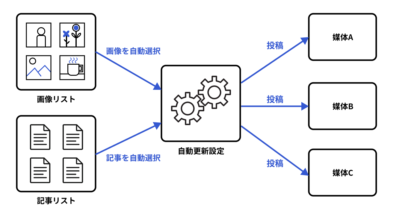 お知らせ形のコンテンツの自動更新のように同じ内容を繰り返し投稿するのとは異なり、写メ日記の自動更新では毎回異なるコンテンツを投稿する必要があります。