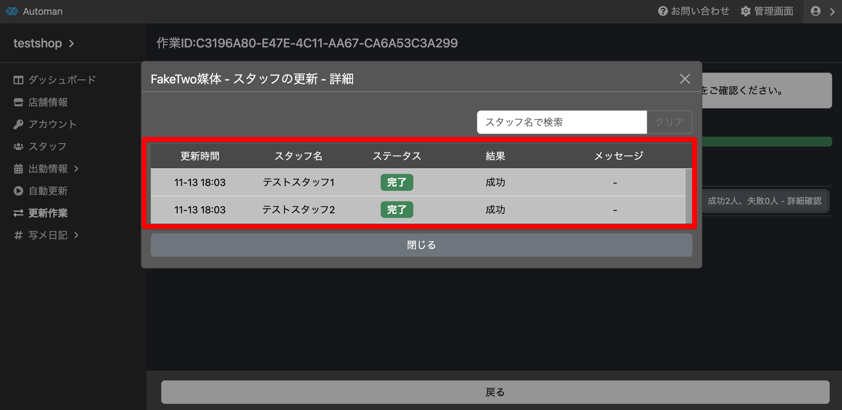 更新するスタッフとターゲット媒体を選択し作業を実行します。