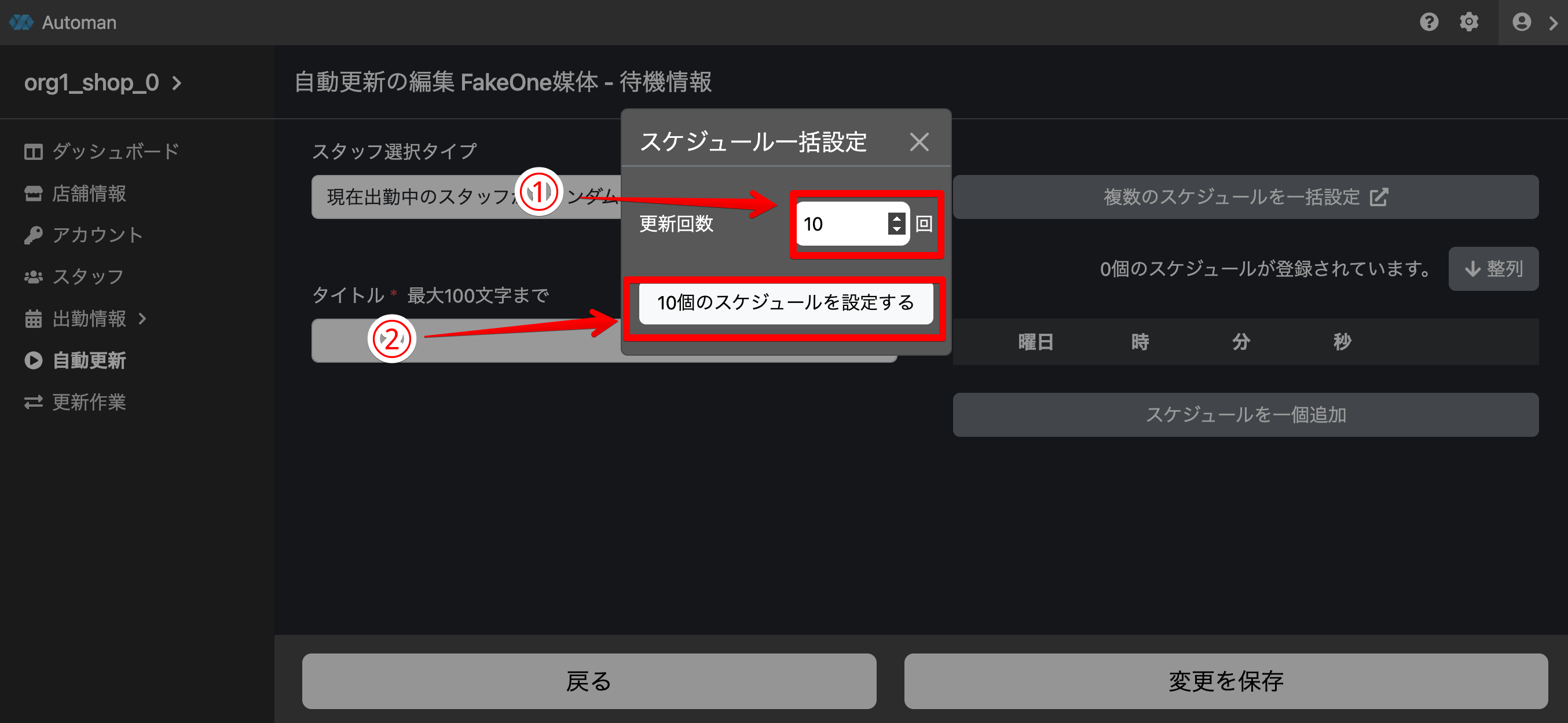 複数のスケジュールを一括設定ボタンをクリック、更新回数からスケジュールを設定する更新間隔からスケジュールを設定する、どちらかをクリックしてスケジュールを設定します。