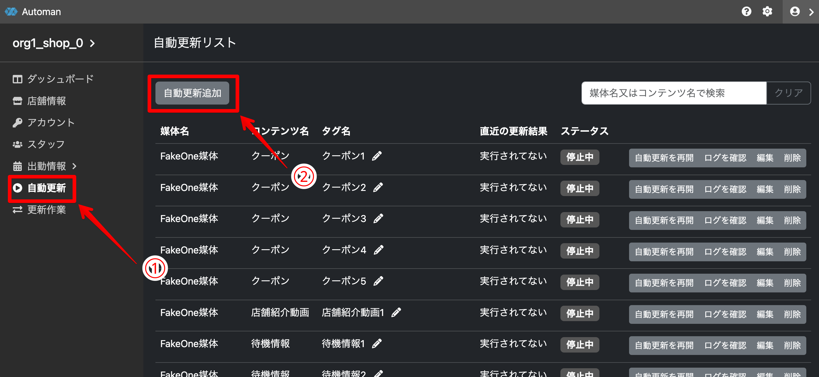 設定内容を保存し、自動更新リスト画面に戻り、自動更新を実行します。