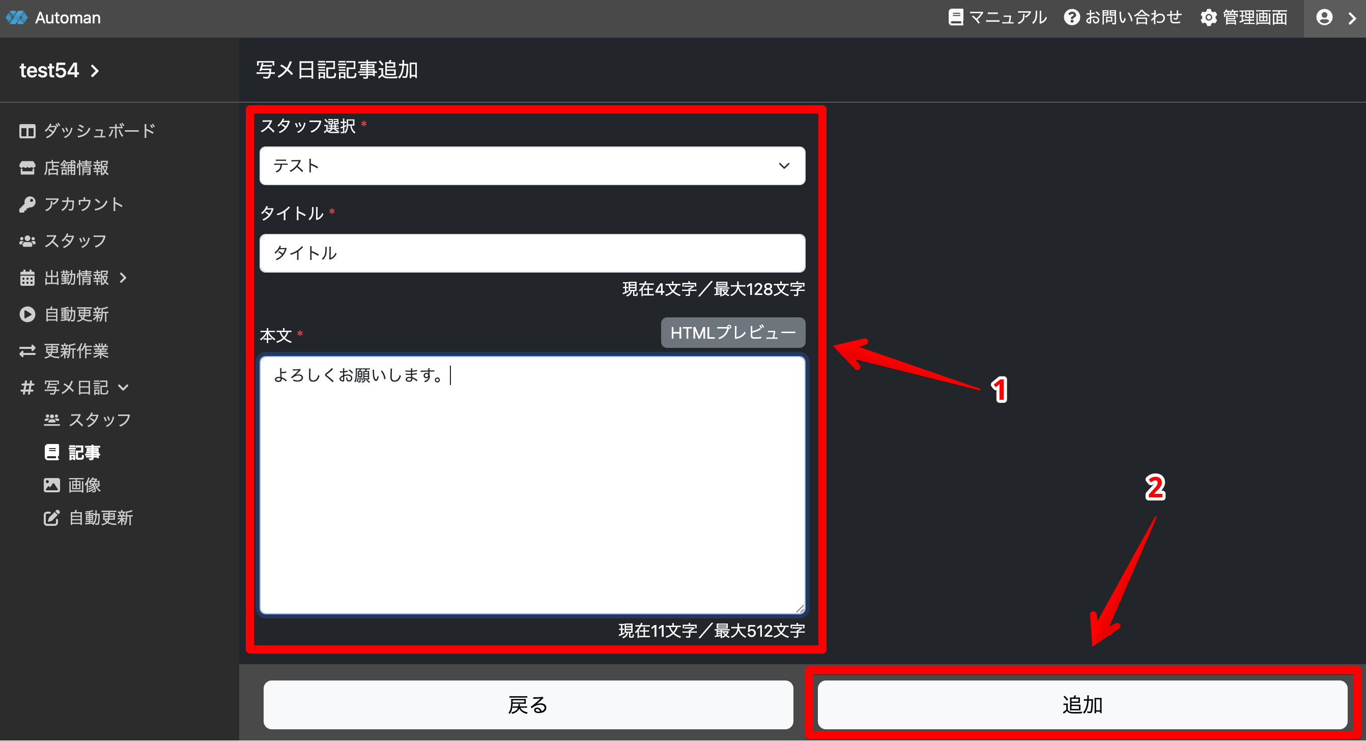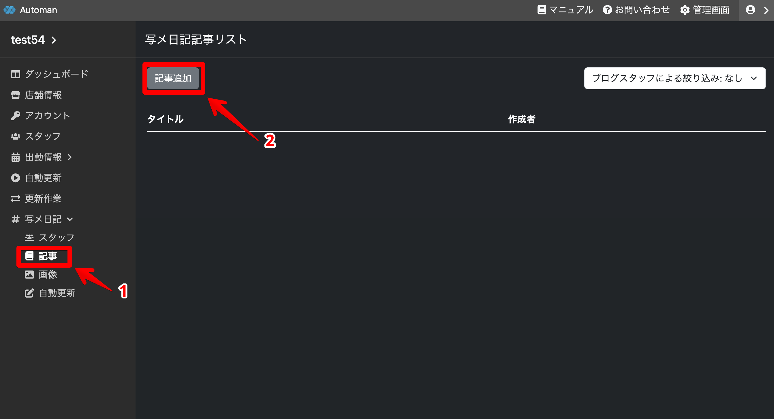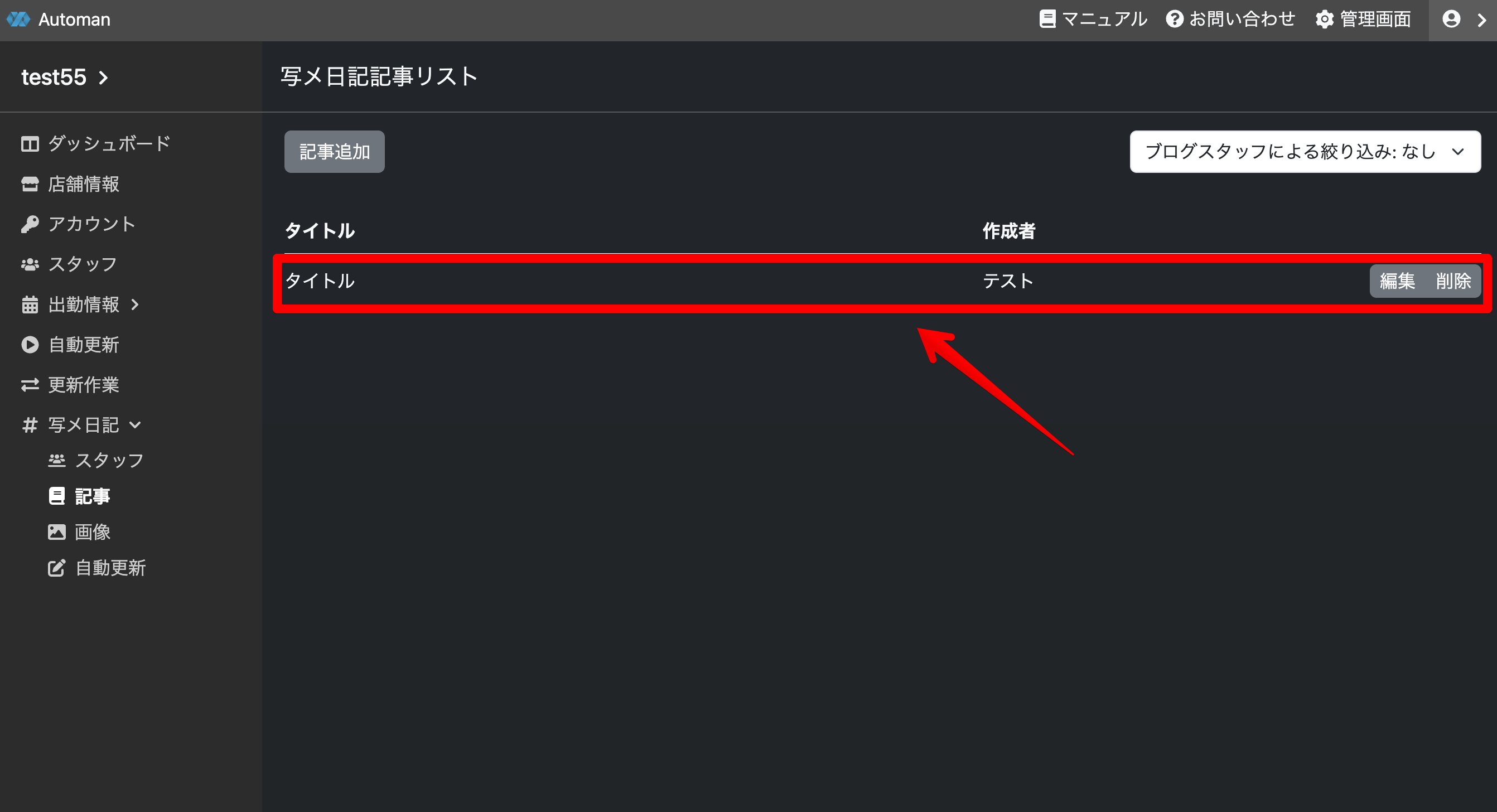 記事のスタッフとタイトル本文を入力して記事を追加します。