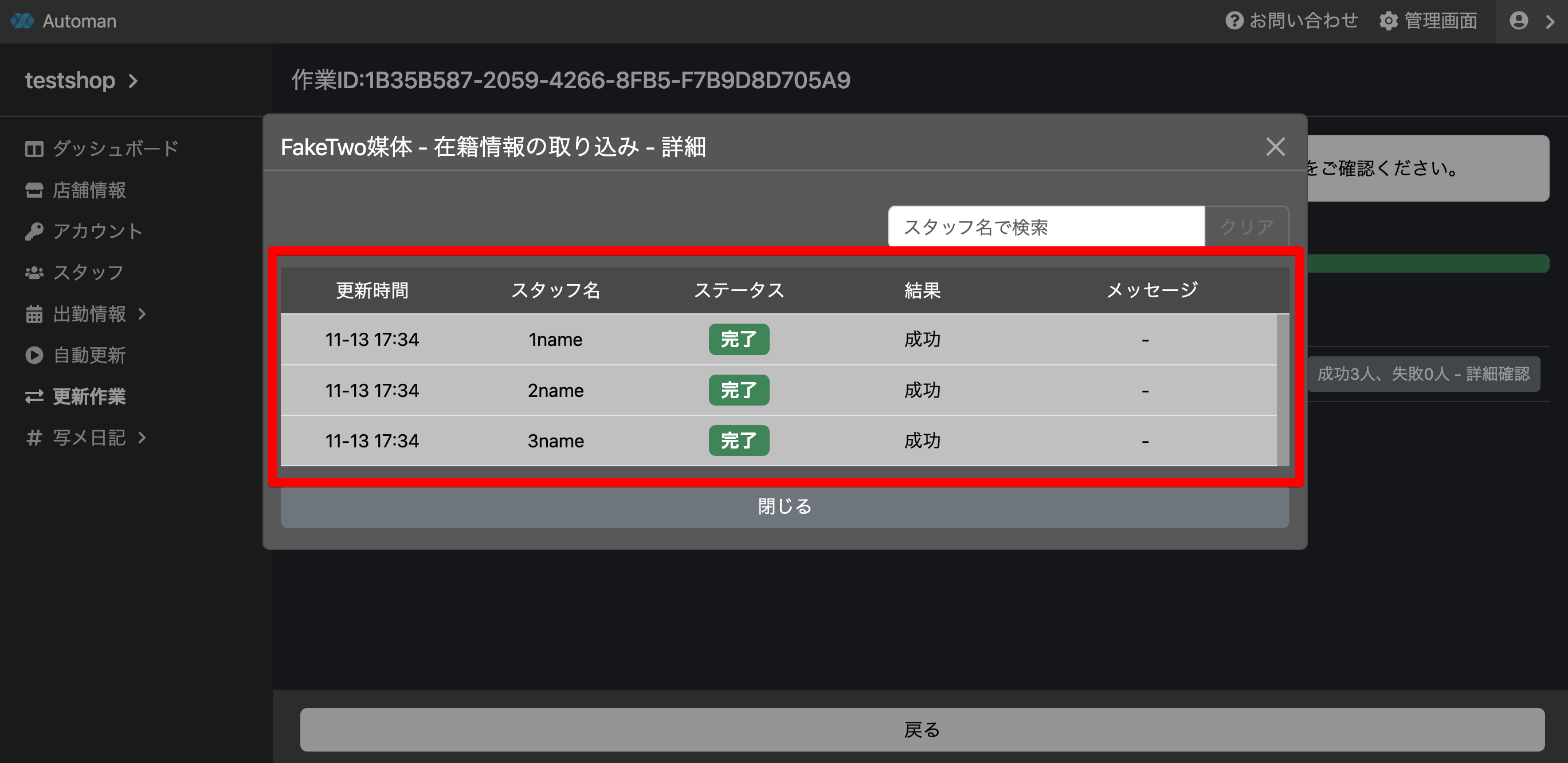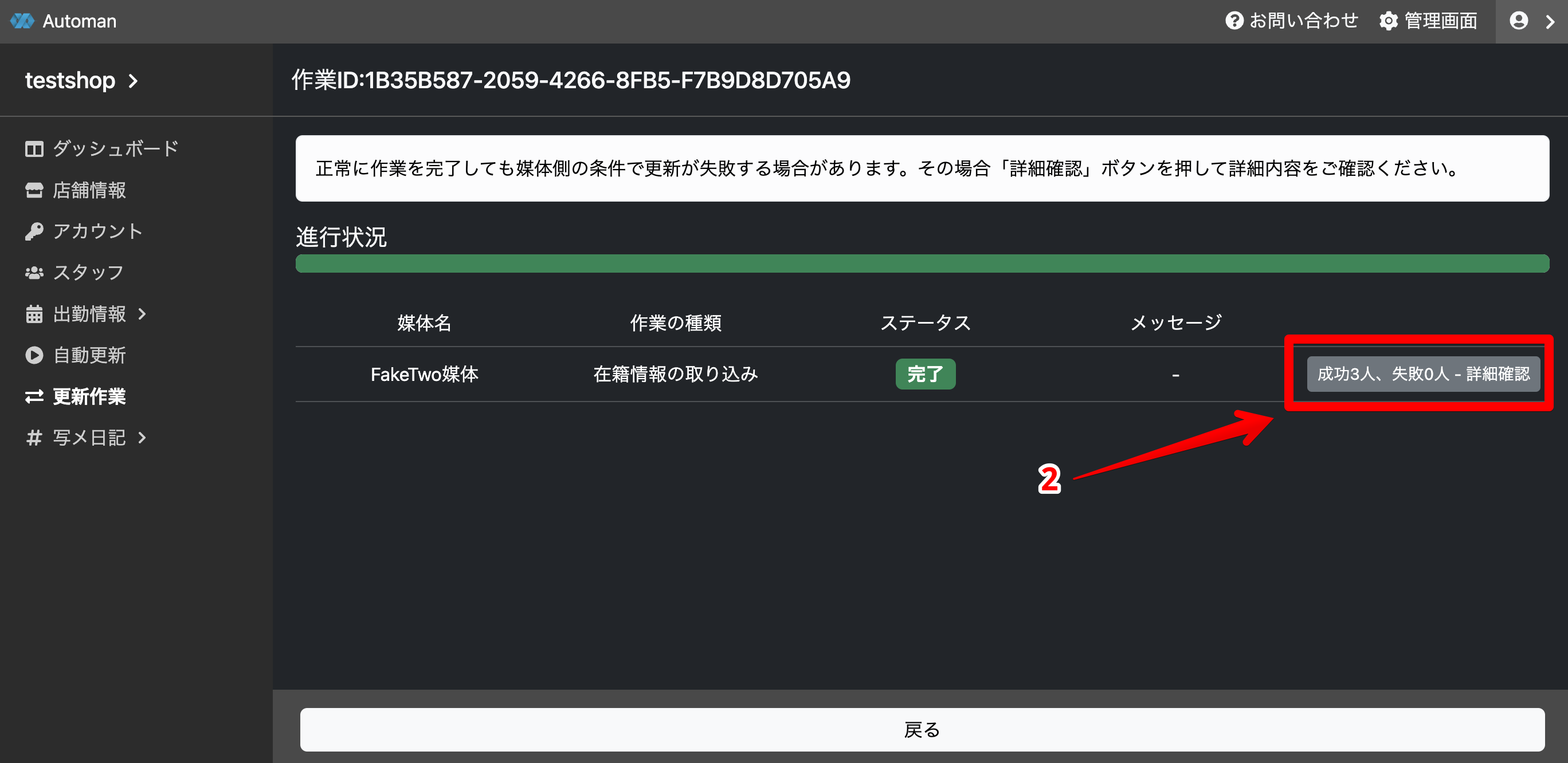 作業の進行状況でステータスが完了になるまで待ちます。その後取り込み作業の詳細を確認します。